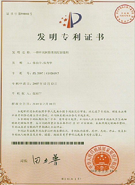 此專利于2007年向國家產(chǎn)權(quán)局提交發(fā)明專利申請,經(jīng)過長達兩年多的審核 認證,于2010年2月通過審核環(huán)氧樹脂基阻尼封裝料專利證書,成功獲得該專利號:ZL2007 1 0192619.7