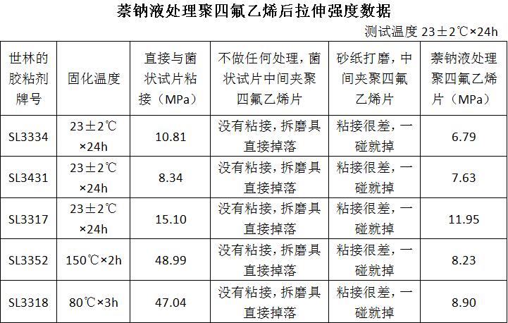 1.經(jīng)萘鈉液處理之后的5種膠粘接強(qiáng)度明顯要高于不做處理的,至于這五種種環(huán)氧膠的粘接對比此數(shù)據(jù)可能存在一定的偏差,目前就測試后的數(shù)據(jù)來看是SL3317最好。因?yàn)橛行┠>叩倪吘墰]有與PTFE粘到一起。